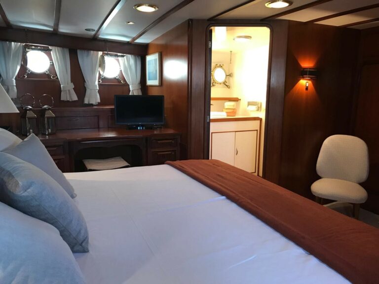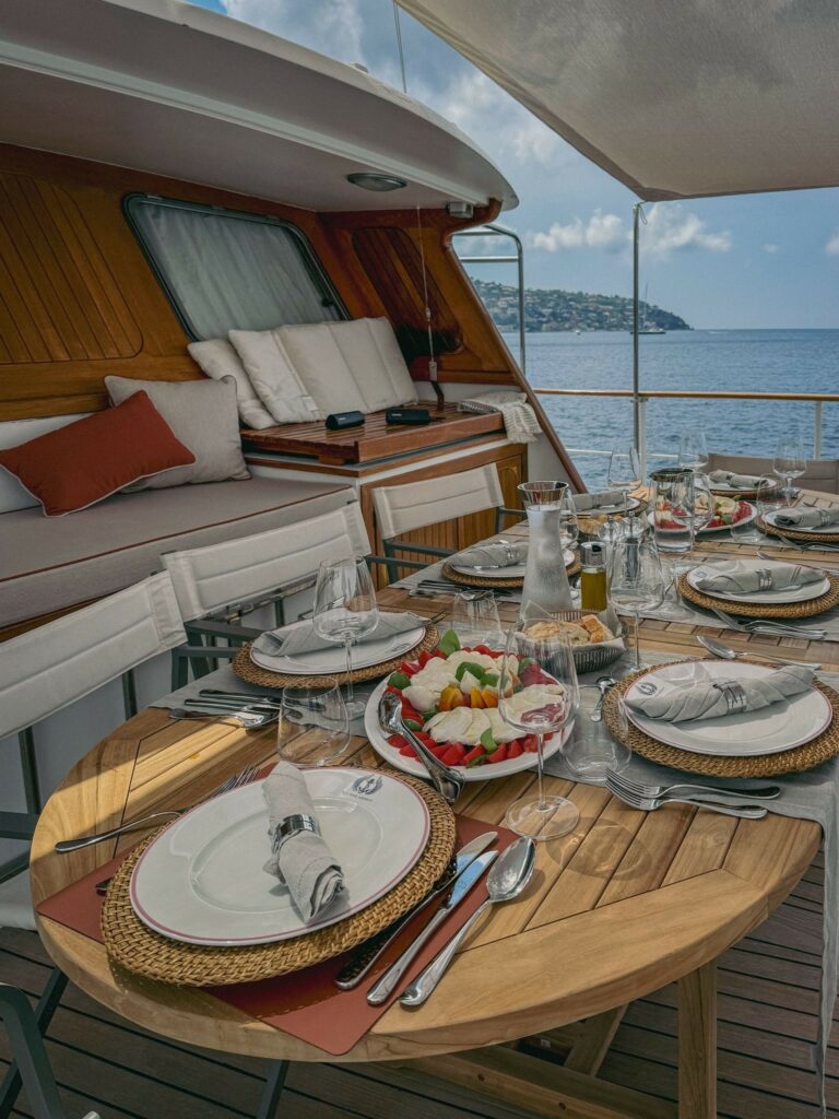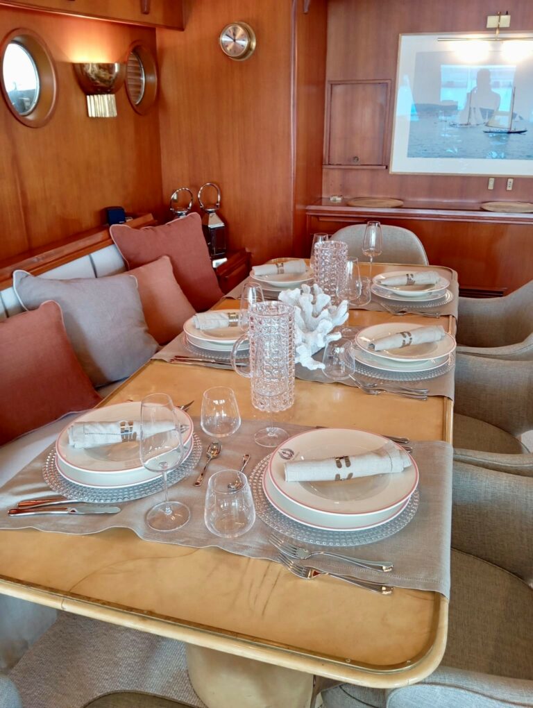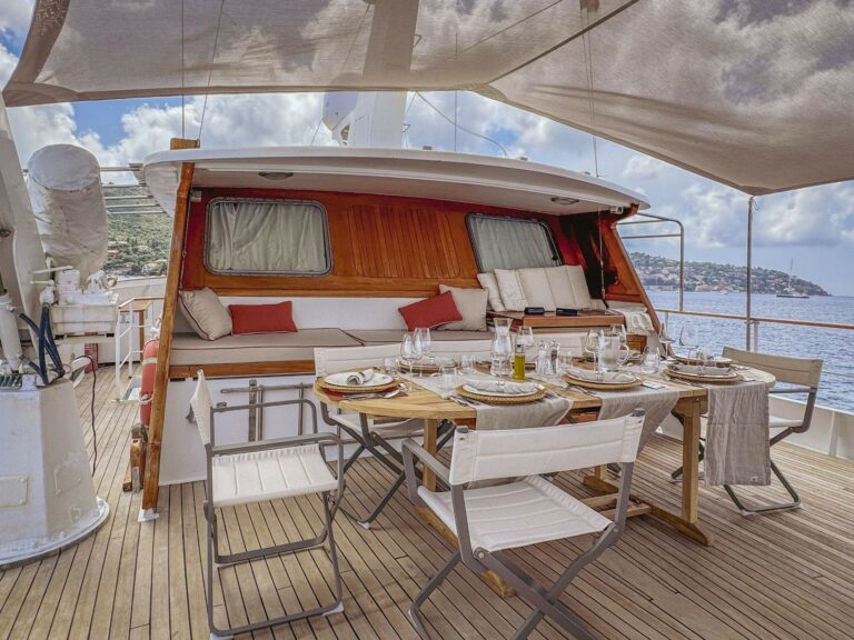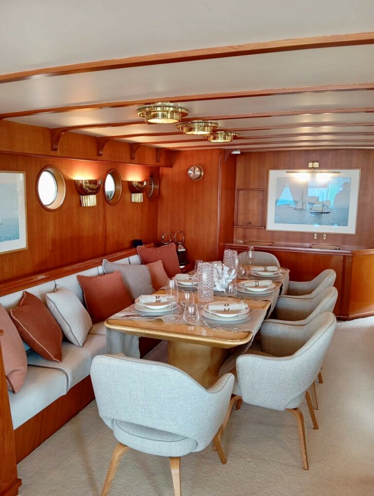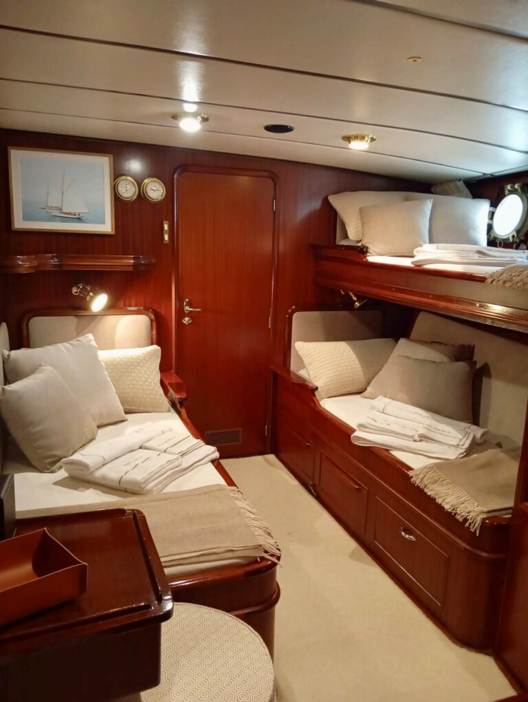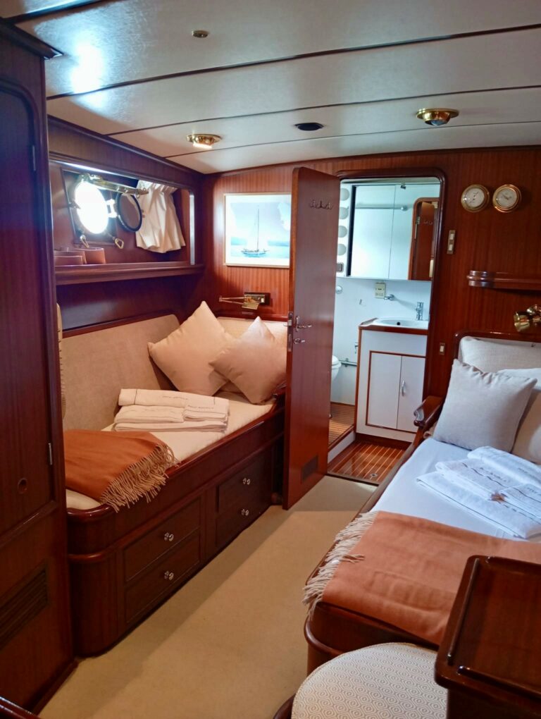 Her classic interiors are charming and have been totally refreshed this winter. She accomodates 7 guests comfortably in 3 cabins with 4 crew members waiting on their every need. She is a gracious classic yacht and represents a great option in the charter market.