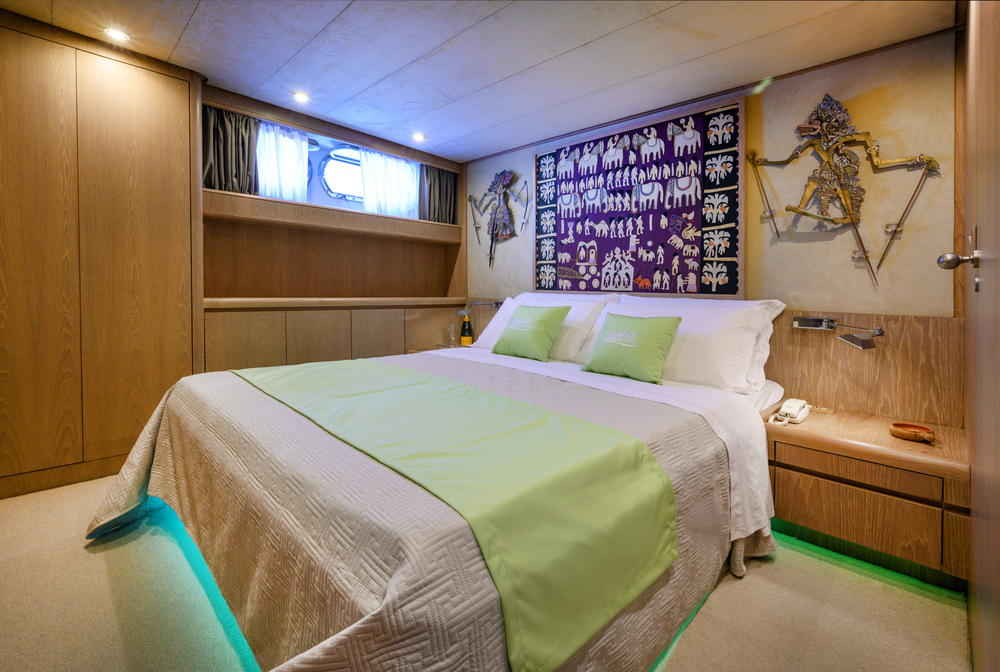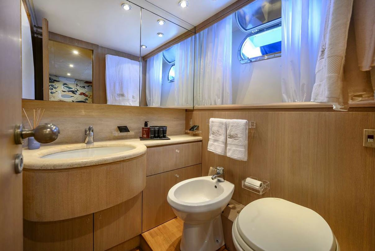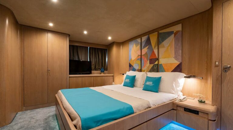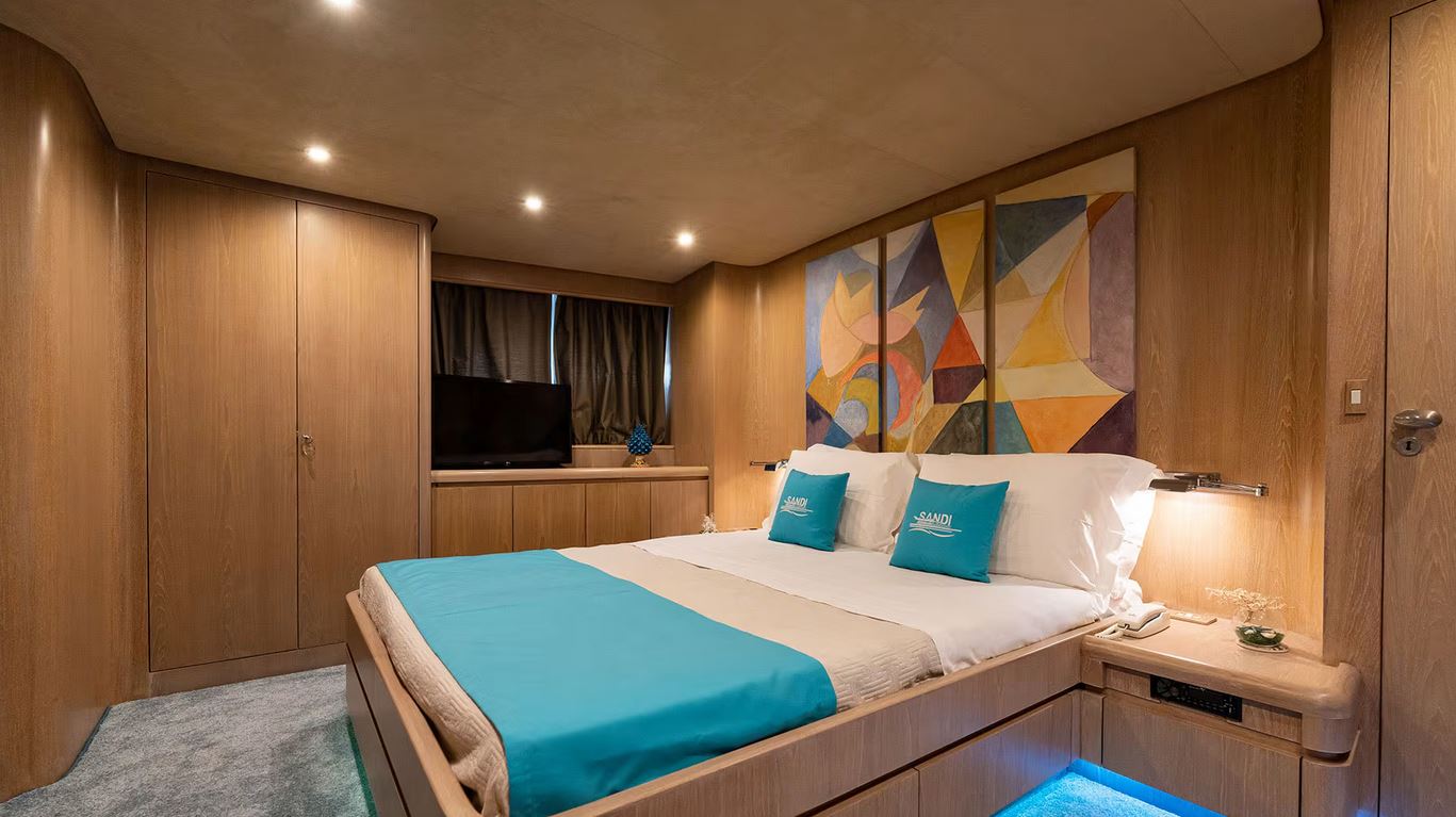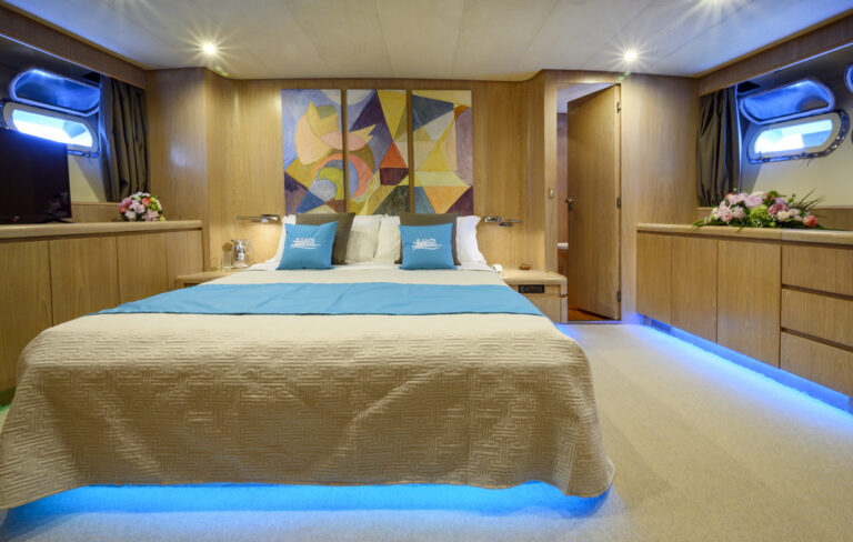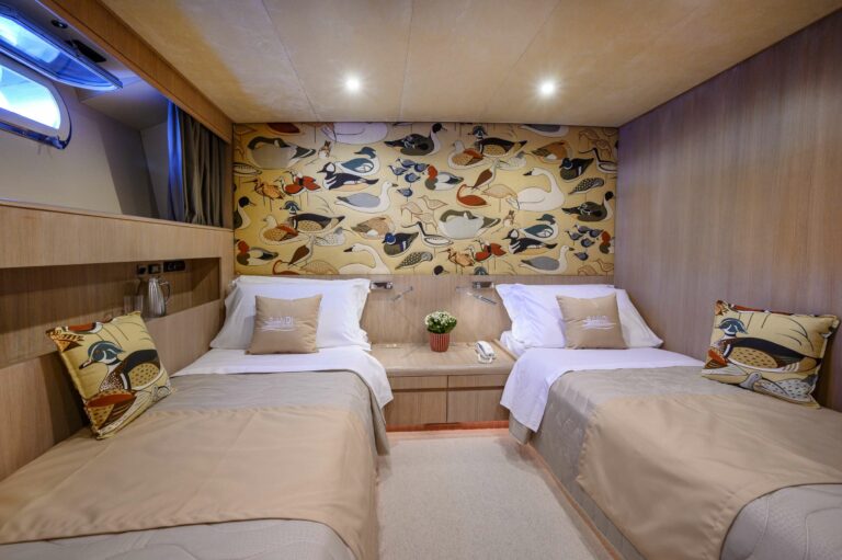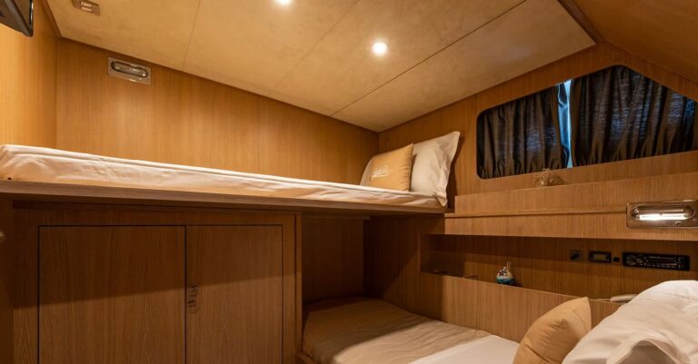 On the lower deck, the yacht accommodates up to 8 guests in 4 cabins: