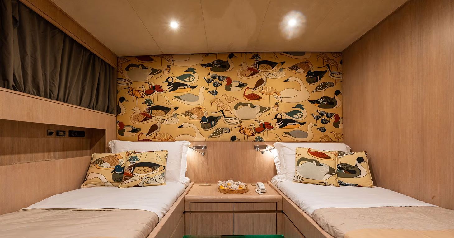 The first three feature private en-suite bathrooms, while the twin cabin has a private external bathroom. All cabins are equipped with satellite TV, DVD player, air conditioning, Bluetooth Hi-Fi, USB ports, and remote controls.