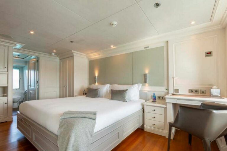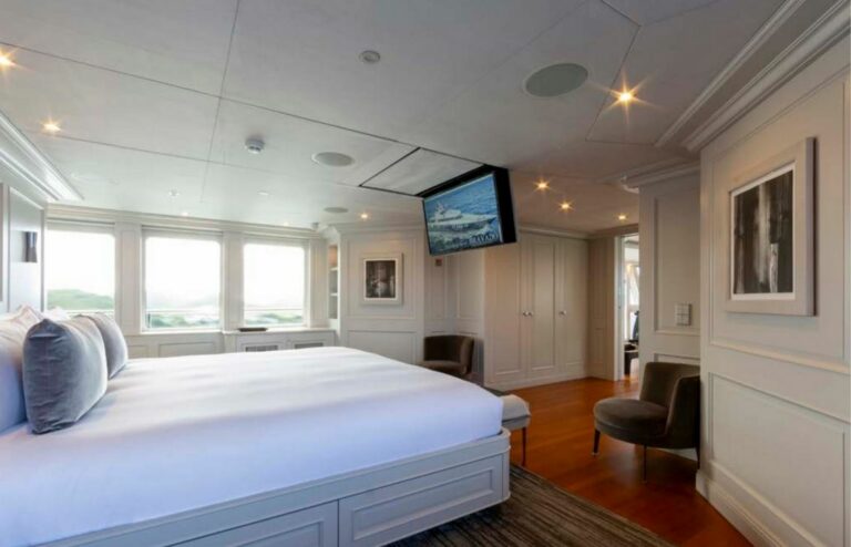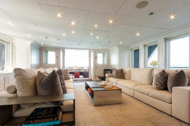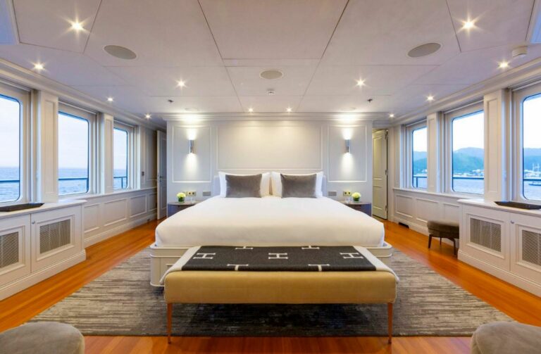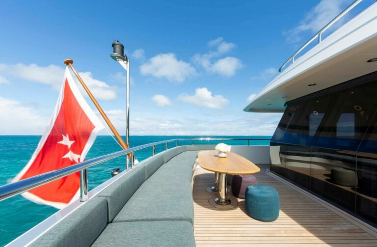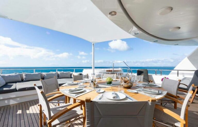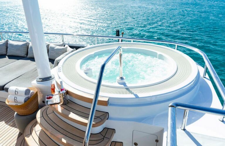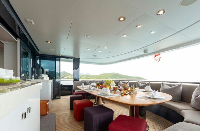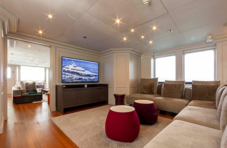 Designed by Reymond Langton, BRAVADO’s sleek exterior features a striking blue hull and elegant white superstructure. The spacious sundeck offers everything needed for outdoor relaxation, including a hot tub, a bar, a large dining table and lounging areas. Additional lounging areas and dining options are also available across the other decks.