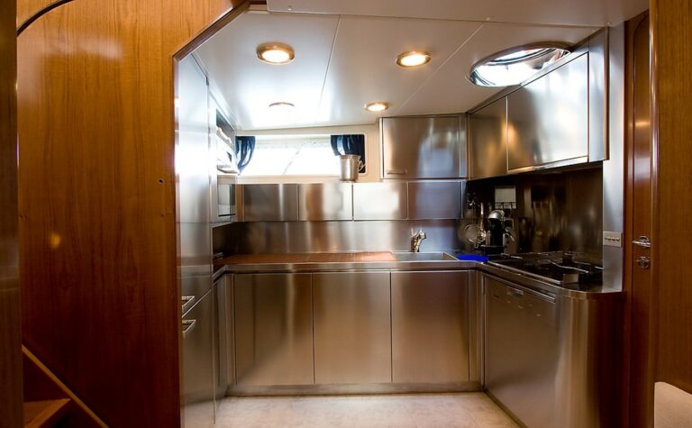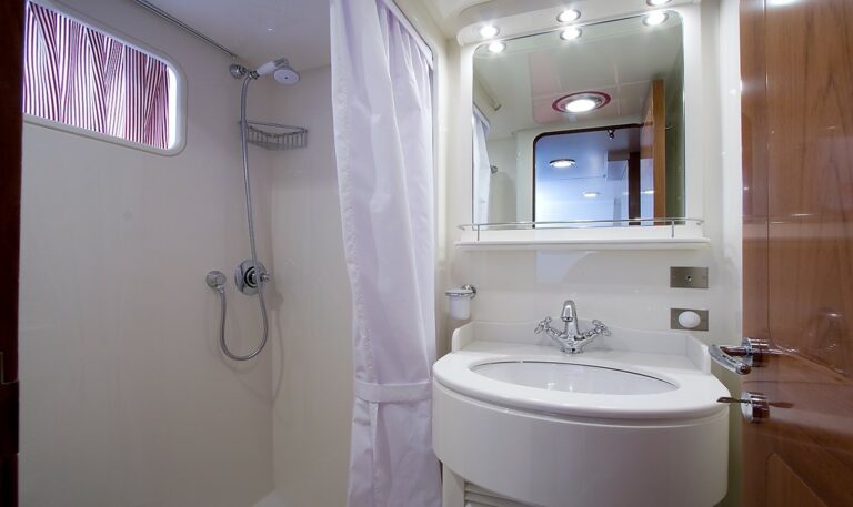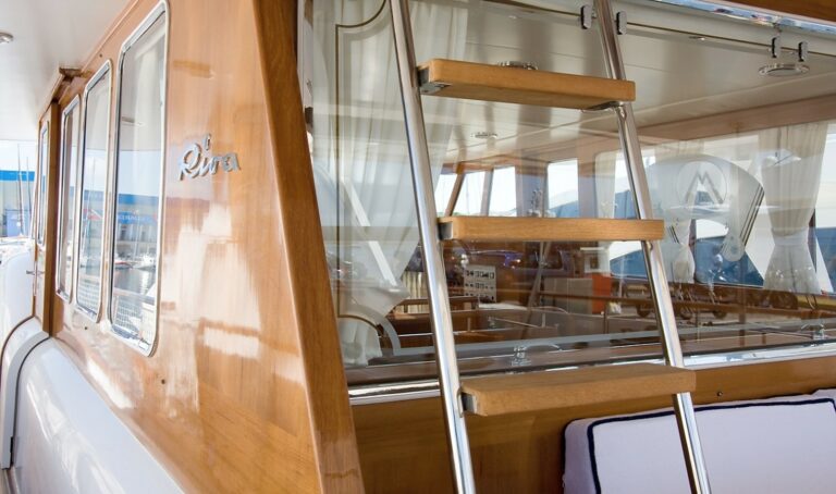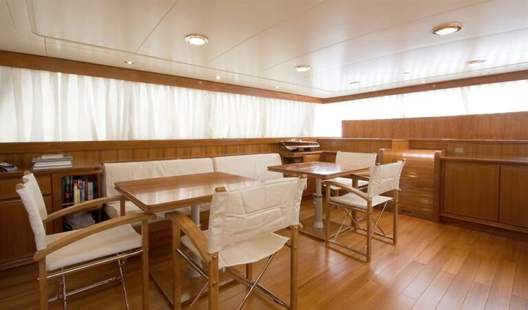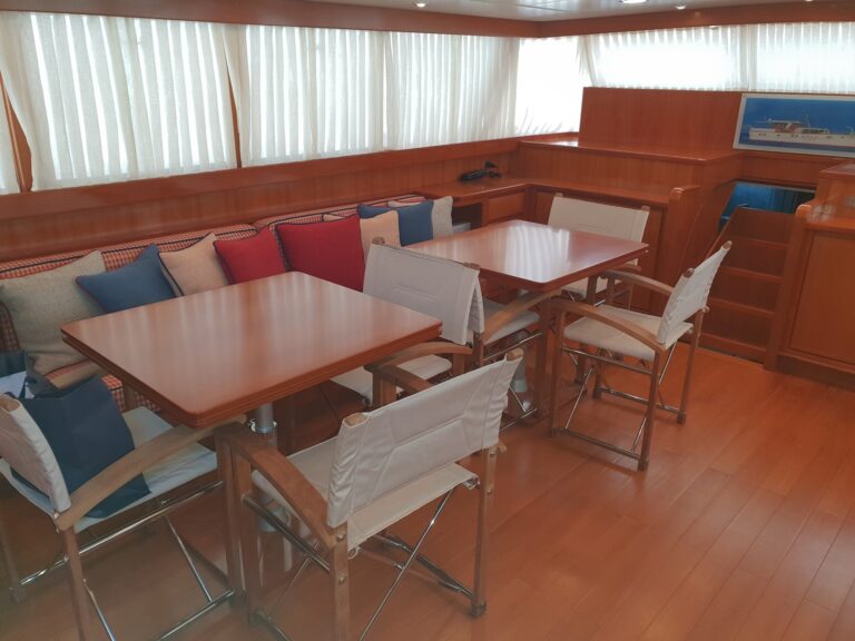 CORBINA was built as part of the second series, the redesign involves an evolution of both the exteriors and interiors. In addition to a further lengthening of the hull, at m. 22.50, the deckhouse acquires more modern lines: the windsocks on the sides of the deckhouse change. The deckhouse is also equipped with windows that give it a more panoramic appearance, in Riva style, thanks also to the curved corner windows of the wheelhouse and dining room. Below deck, the three aft cabins now each have their own bathroom and consequently an additional porthole appears on the port side. The portholes of the two sides therefore become symmetrical and change their design.