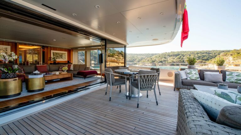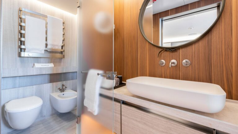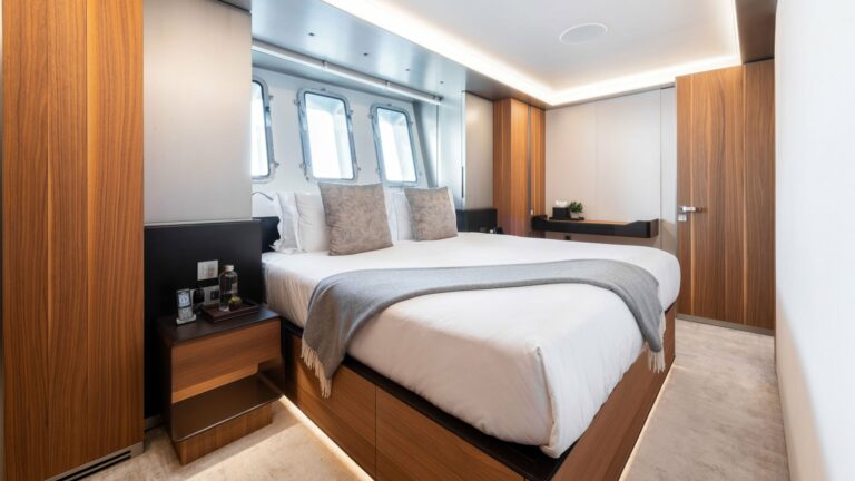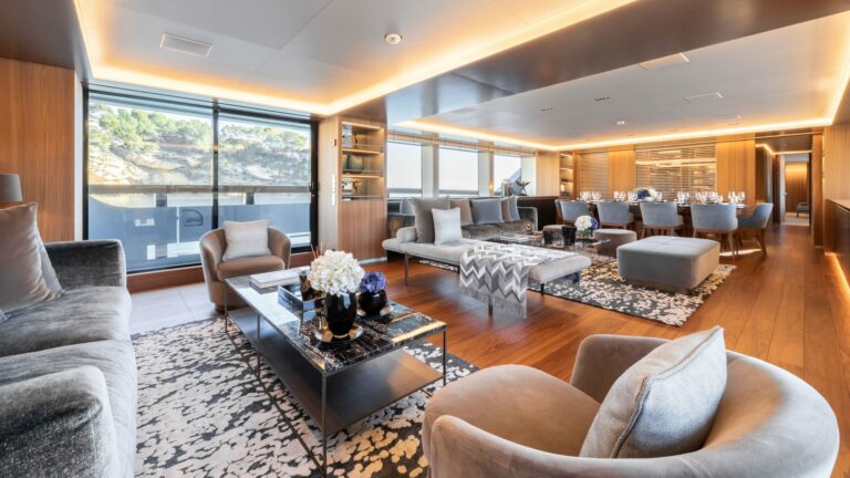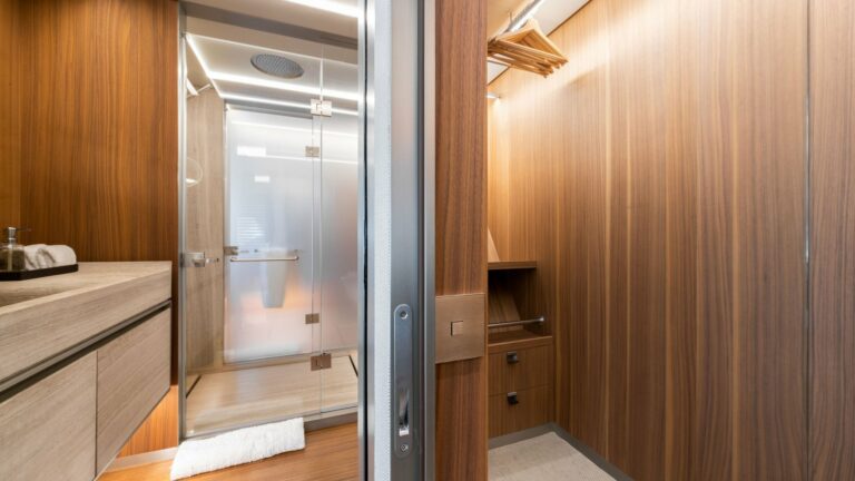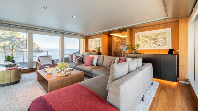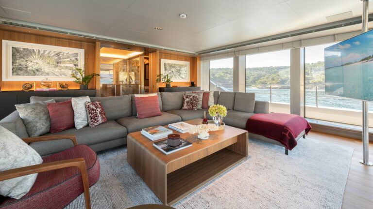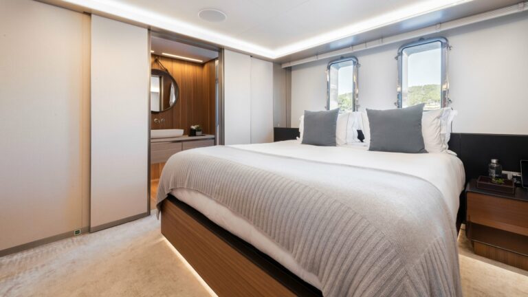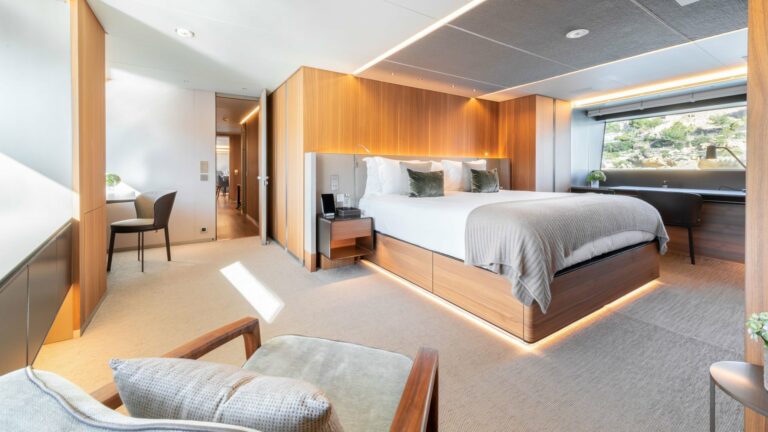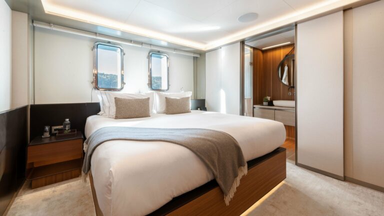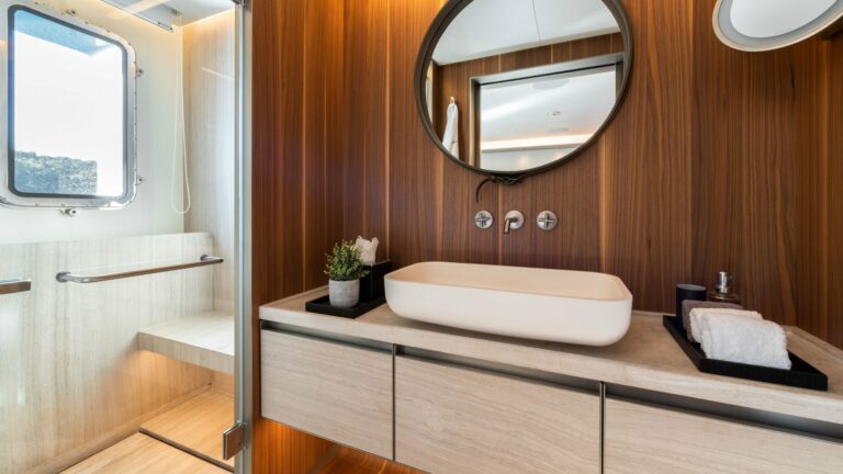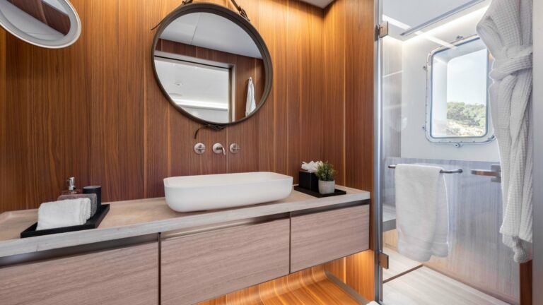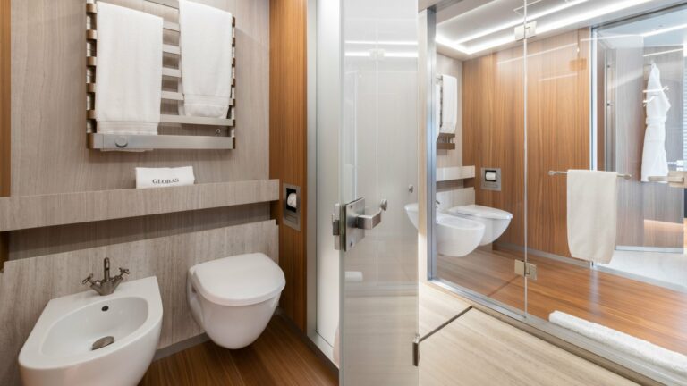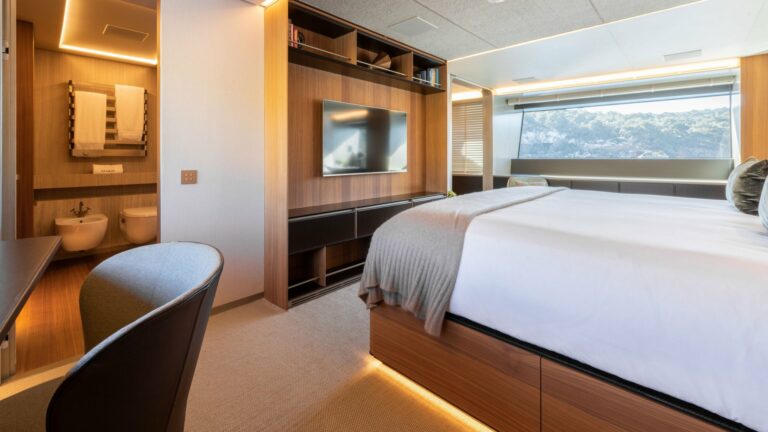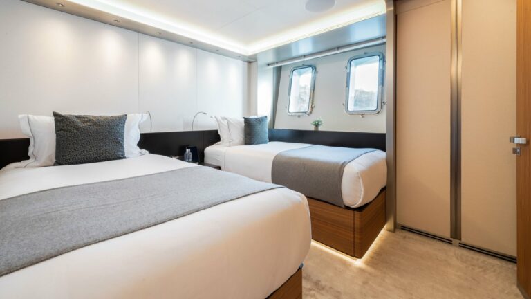 Globas accommodates up to 12 guests in 6 well-appointed cabins. The spacious master suite is located forward on the main deck and boasts his and hers bathrooms, connected by a stunning central shower as well as an office and seating area. On the lower deck, are five additional cabins, including two VIPs aft, two twin cabins and a family cabin with a queen size bed, each with ensuite shower rooms.