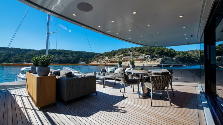 A functional and luxurious interior, with large windows and a generous 7 foot ceiling height throughout the guest areas guarantee comfort on any voyage. The generous and  adaptable aft deck spaces provide many opportunities for any adventure loving owner.  The forward placed superstructure provides a perfect area for storing all kinds of toys and tenders or, when at anchor, playing host to all kinds of relaxation, recreation or entertaining.