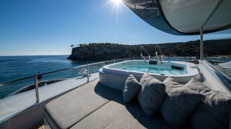 A highlight is the sundeck with it’s forward jacuzzi and sheltered bar area plus dining for 12 means you can really spend the whole day there.  The beach club swim platform has enough space for sun lounges and is a perfect launch platform for all the toys.