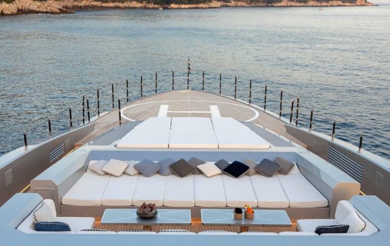 Her deck spaces are vast and she has a touch and go Helipad on the bow with direct guest access to the sun deck . A unique feature on a yacht of her size.