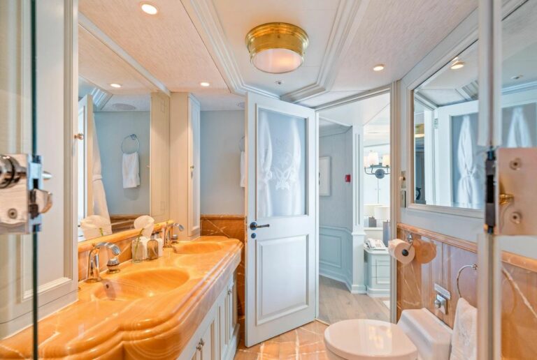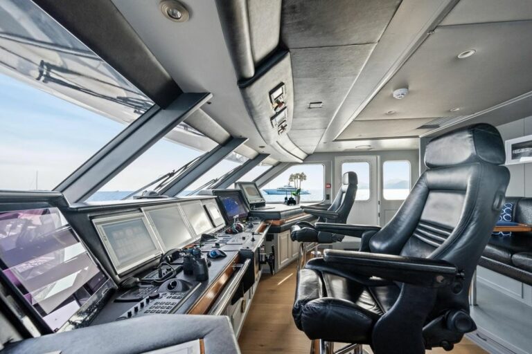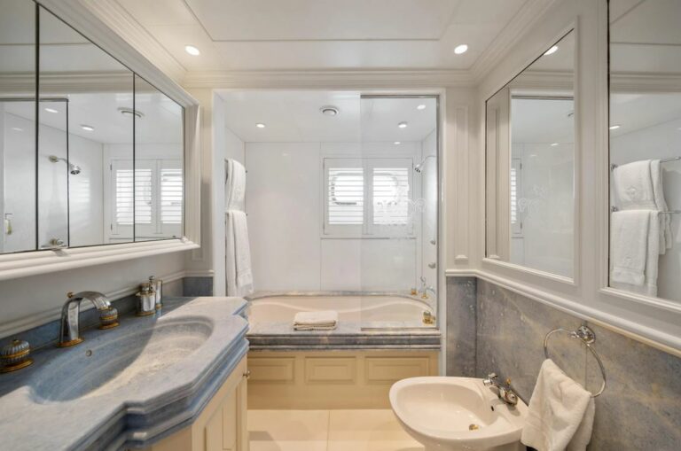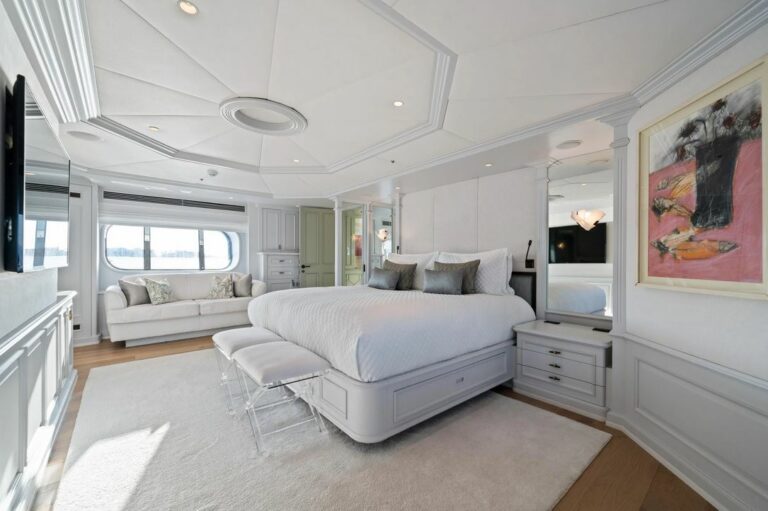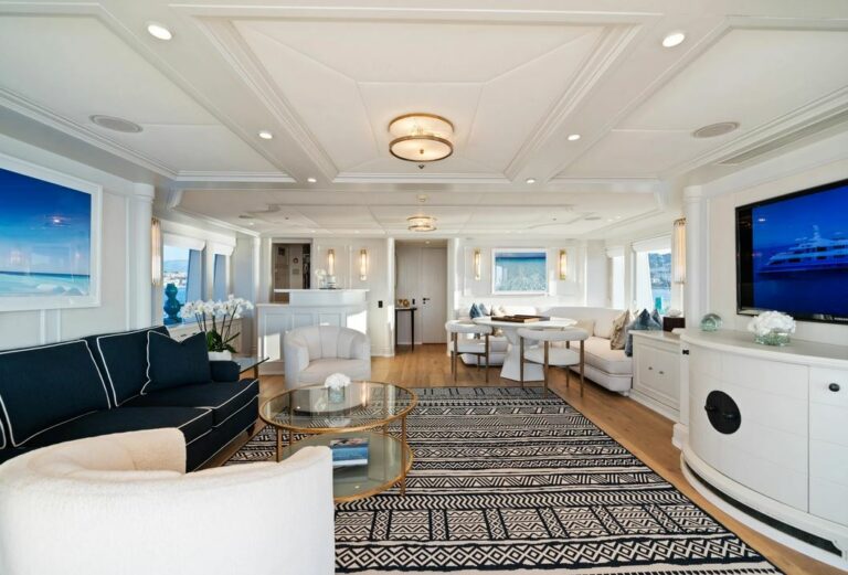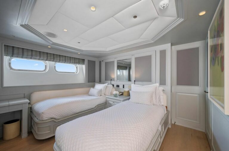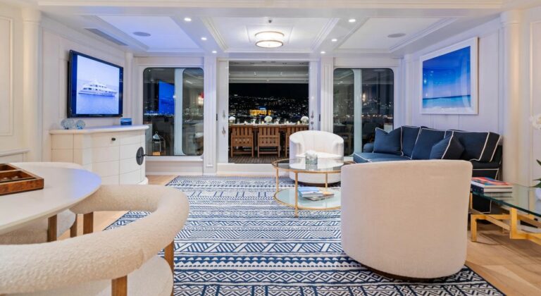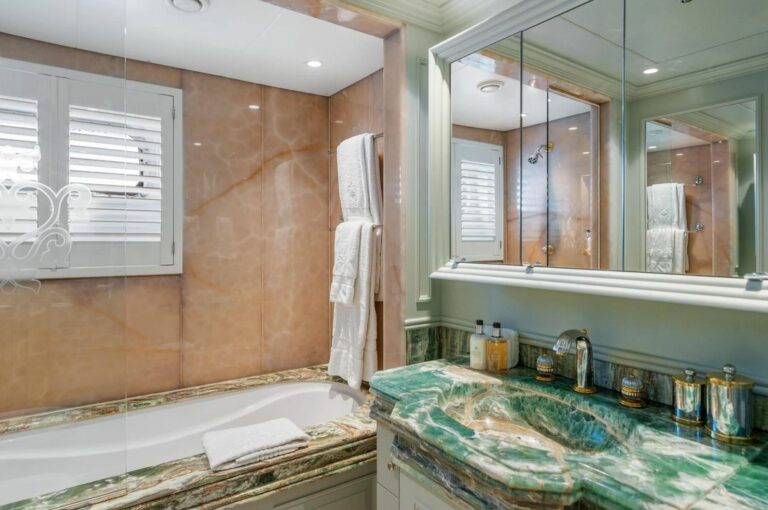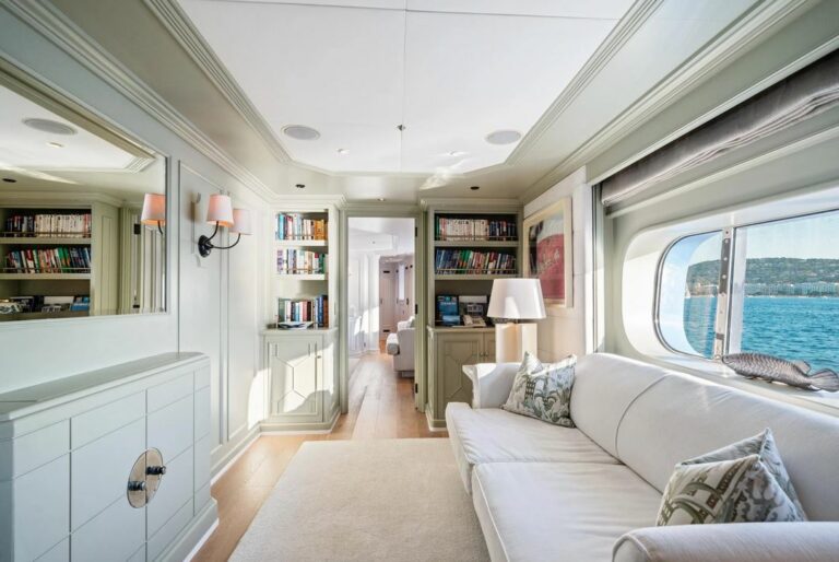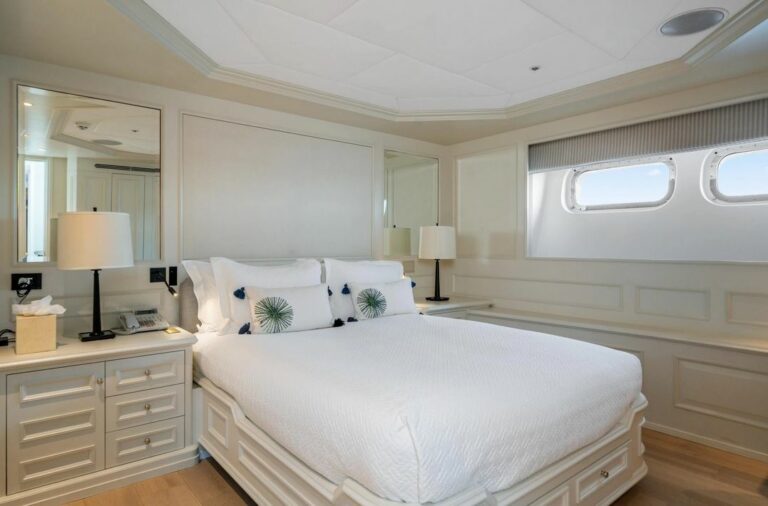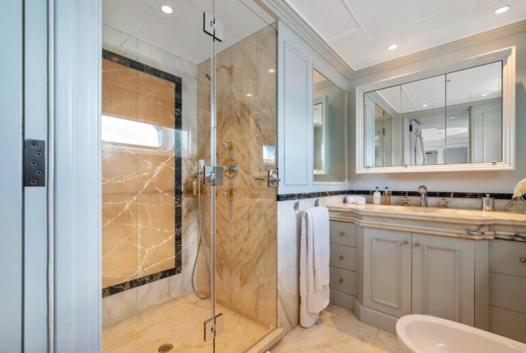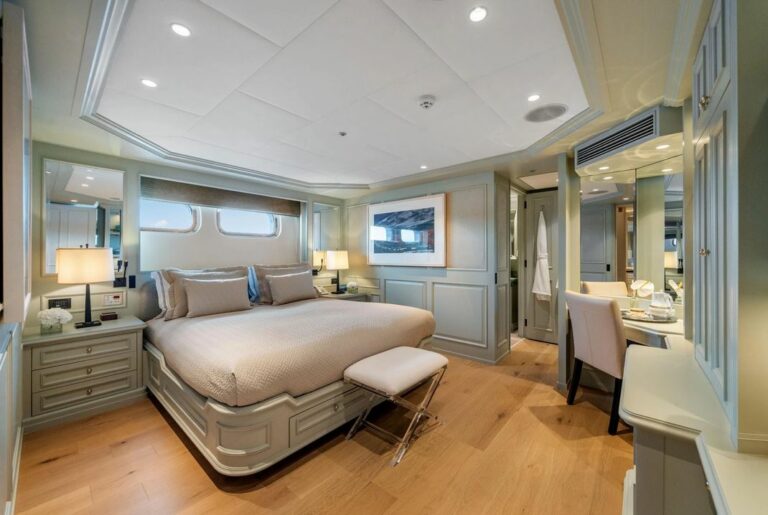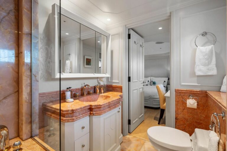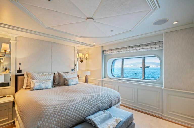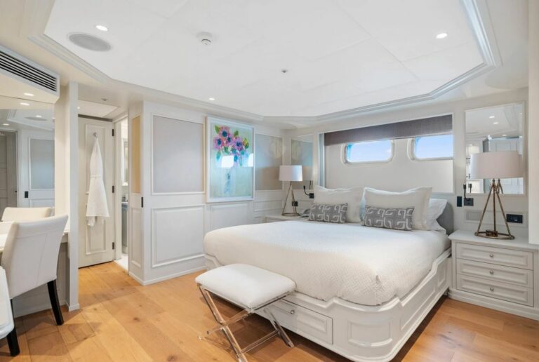 Accommodation is spacious and serene, led by a stunning full-beam master suite on the main deck, with a dedicated lounge and an ensuite bathroom finished in onyx and marble. Five additional guest cabins are equally well-appointed, and an AV system ensures access to entertainment throughout the yacht.