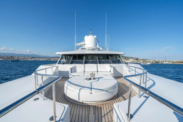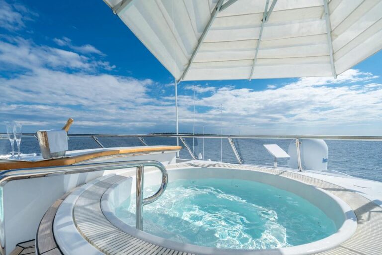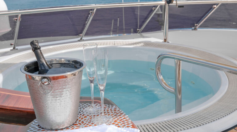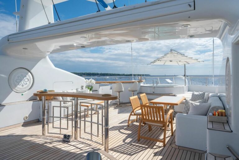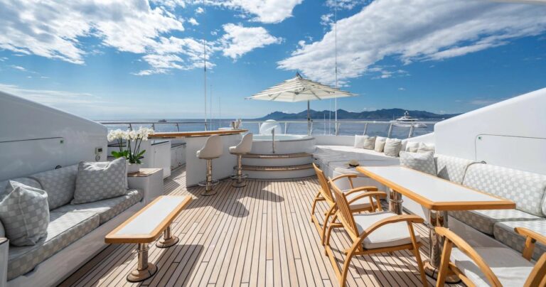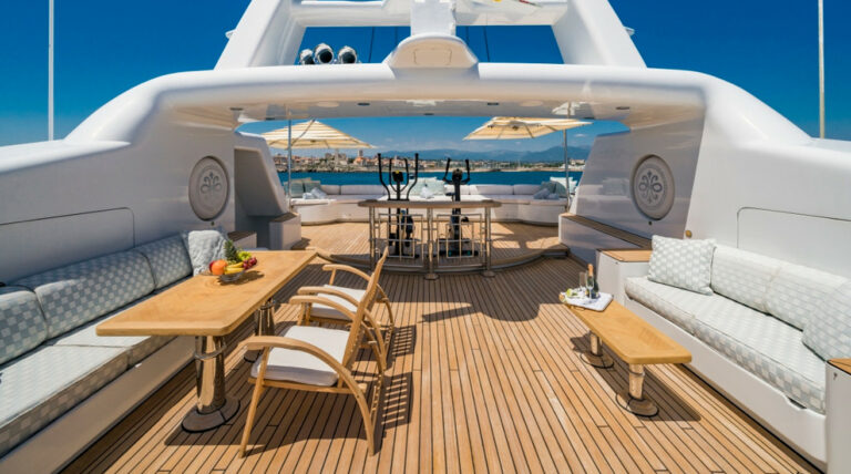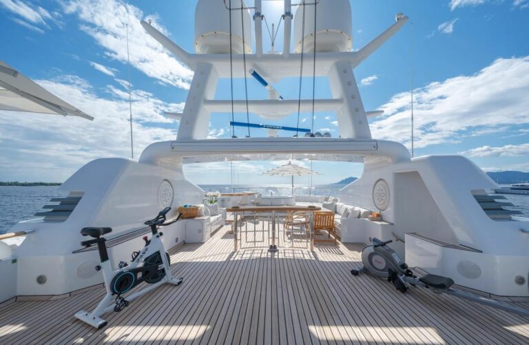 The sundeck is designed for all-day indulgence, jacuzzi, bar, sun pads and lounges.  For alfresco dining, two tables provide the perfect setting for long, leisurely meals with sweeping sea views. The deck also features a compact gym with cardio equipment and free weights, all shaded by a Bimini for comfort.