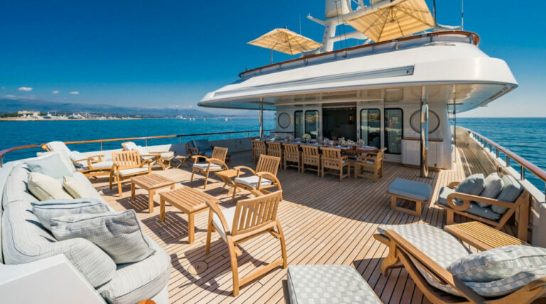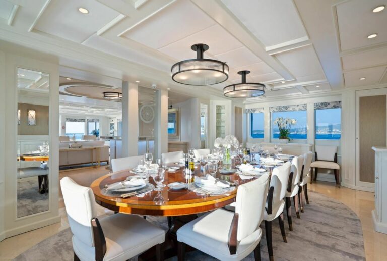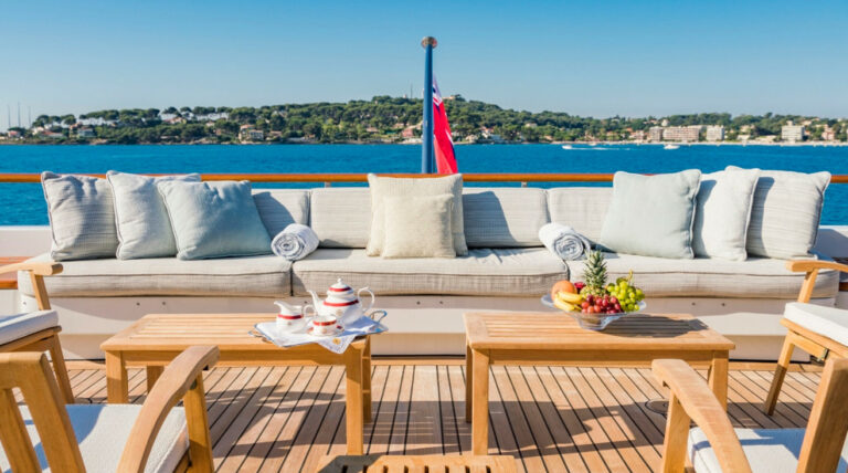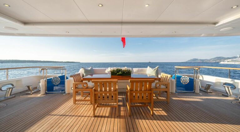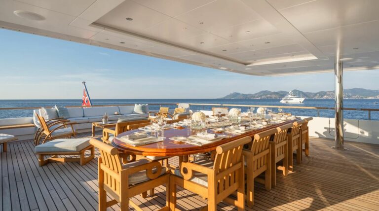 On the bridge deck aft, a beautiful teak table accommodates up to 16 guests for outdoor dining under the stars. Whether hosting a celebration or enjoying a quiet dinner, MOSAIQUE offers the versatility and comfort to make every moment onboard unforgettable.
